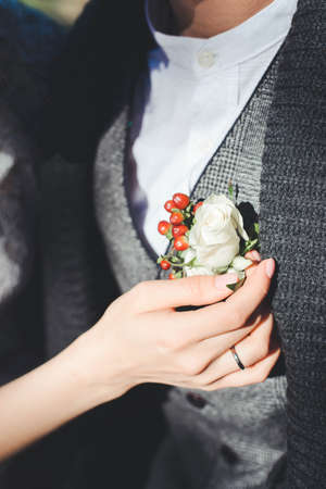Hands of bride outdoors. Bride corrects boutonniere on grooms wedding jacket