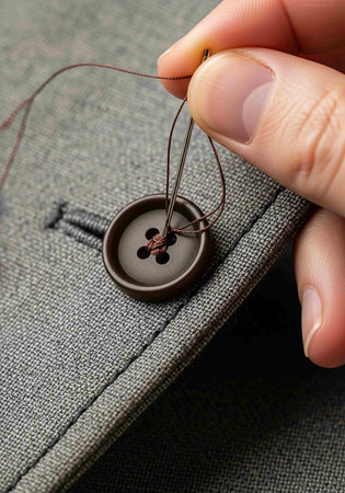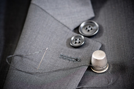 A needle and thread sews up a button on a plaid suit. Thimble. Textile