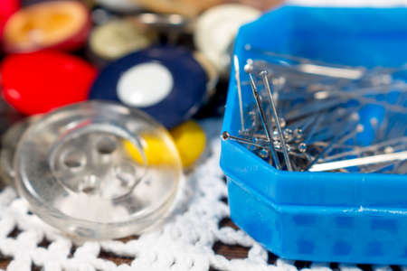 Blue box with sewing pins beside different buttons, on a crocheted doily