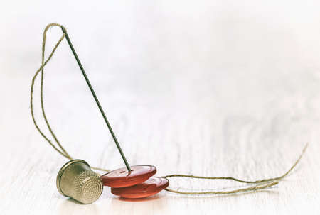 Old sewing accessories for sewing handmade on a white background, a needle and thread, a thimble. Needlework set.