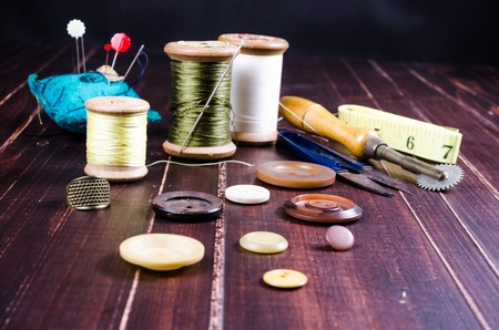 set of sewing tools - scissors, needles, buttons, thread on a table