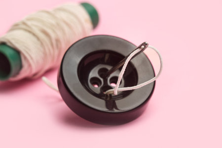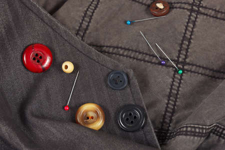 Buttons, Thread and Sewing Needle on Denim. Close-up