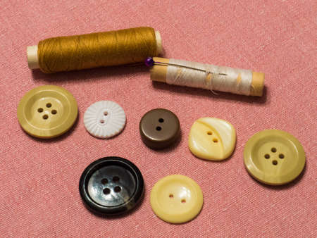 Accessories for needlework. Spools of thread, buttons, measuring tape, sewing supplies.