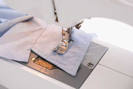 Woman hands using the sewing machine to sew a colorful face medical mask during the coronavirus pandemic. Homemade DIY protective mask against the virus. Sewing masks, COVID-19. Selective focus.