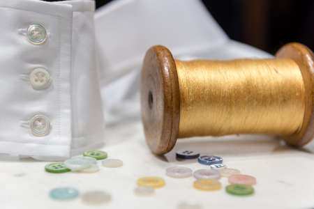 Wooden Spool with Yellow Threas with Assorted Buttons and White Shirt Cuff
