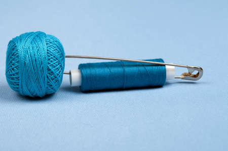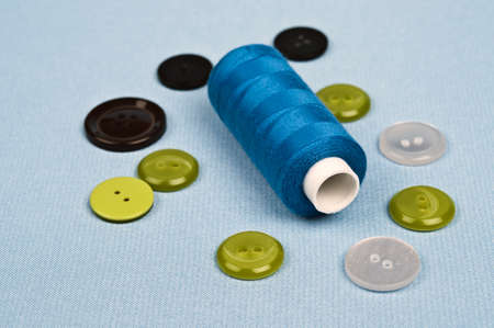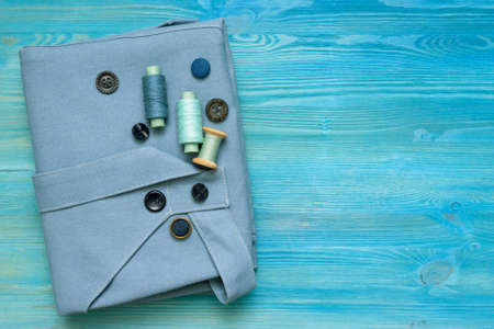 Blue dress, thread spools and sewing buttons on the blue background with copy space.
