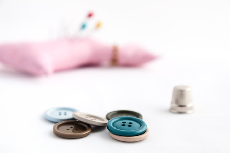 Sewing utensils, scissors, threads and buttons colors isolated on white background