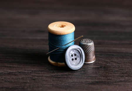 Spool of light blue thread with needle, button and thimble on wooden table. Sewing accessories