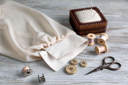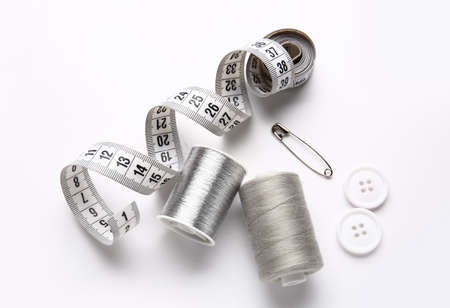 Sewing items from above. Flat lay composition with sewing accessories on light color background. Items for sewing, Sewing clothes, measuring tape, tailoring scissors, threads, buttons and needles