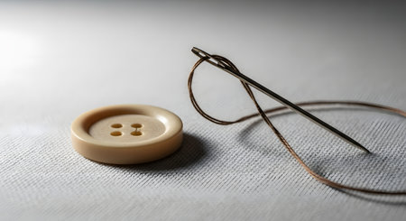 A macro, close-up shot of a sewing needle threaded with brown thread, lying next to a single beige, four-hole button on a white textured fabric. This minimalist image represents sewing, mending, tailoring, crafts, or DIY projects.