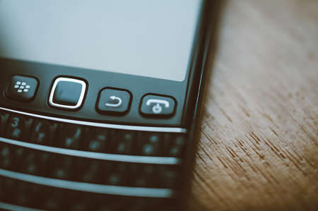 London, United Kingdom - Apr 21, 2013: Vintage image of luxury Blackberry smartphone telephone with full qwerty keyboard - tilt-shift lens used