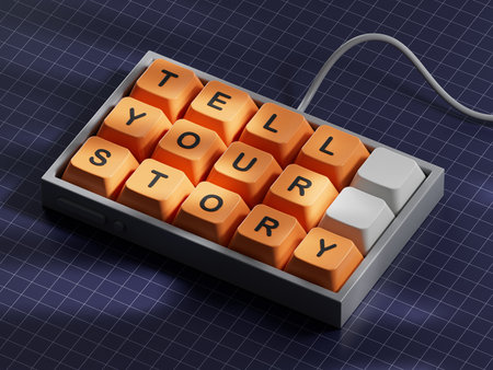 Tell your story symbol. Computer keyboard keys with words Tell your story.Business and Tell your story concept. Computer keyboard keys. Copy space.3D rendering on blue background.