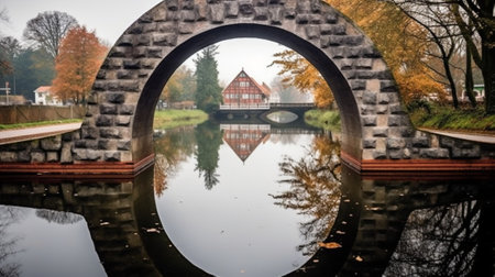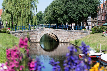 Friedrichstadt, Germany - September 06, 2021: Mittelburggraben in Friedrichstadt. Historic stone bridge over the canal in Friedrichstadt