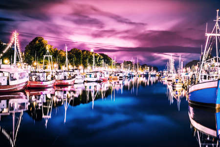 night view of canal with ships and Baltic Sea in Warnemunde, Rostock Germany