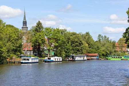 wooden boats floating on river water near house buildings and tree with blue cloudy sky outdoor at Luneburg, Germany