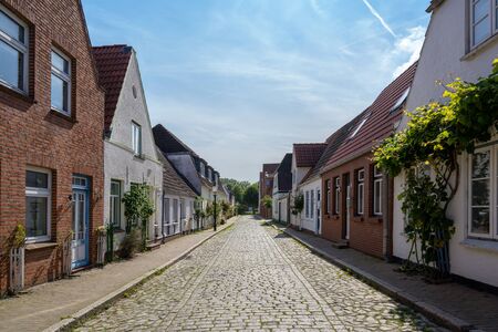 street with low houses, cobblestones and roses in Friedrichstadt, the beautiful town and travel destination in northern Germany founded by Dutch settlers, copy space