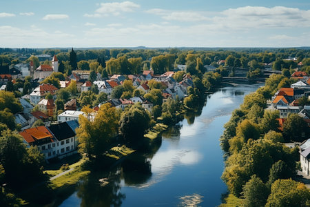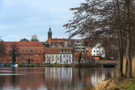 Lake shore with houses and the tower of the St. Petri church in Ratzeburg, a beautifully situated small town in northern Germany, copy space