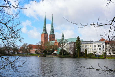 Lubeck cathedral with two towers in historic brick architecture, famous landmark behind the idyllic mill pond, cloudy blue sky, copy space, selected focus