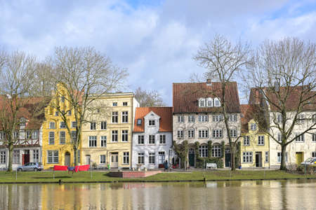 Beautiful historic house facades on the banks of the river Trave in the old town of the hanseatic city of Lubeck, Germany, blue sky with clouds on a sunny day in early spring, copy space