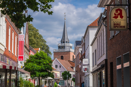 Aurich, Germany - September 29, 2018: Beautiful view over the pedestrain zone of the city of aurich. In the background the steeple of the church.