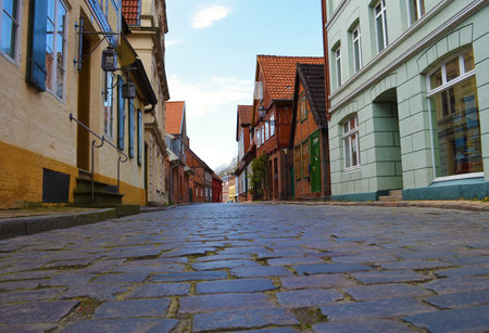 Low angle shot to a historical cobblestone alley with colorful half-timbered houses - Lauenburg, Germany - 04/23/2016
