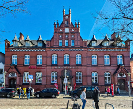 Neumuenster, Germany - 16. April 2022: The historical building of the old post office with a ReWe supermarket in Neumuenster, Germany