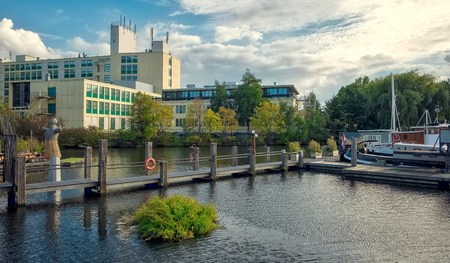 Low view over the water that lies next to the Vroesenpark in Rotterdam, the Netherlands