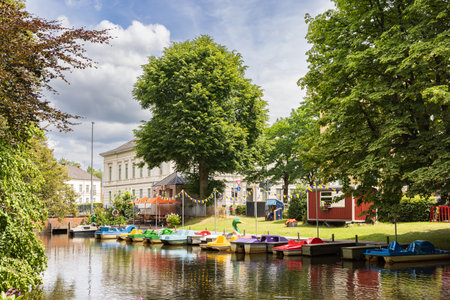 Oldenburg, Germany - July 28, 2022: Water fun along the Muhlenhunte in castle park in the centre of Oldenburg in Lower Saxony in Germany Europe