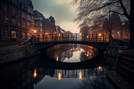 pedestrian bridge across a channel in residential neighborhood in Hamburg, Germany in warm evening sunlight