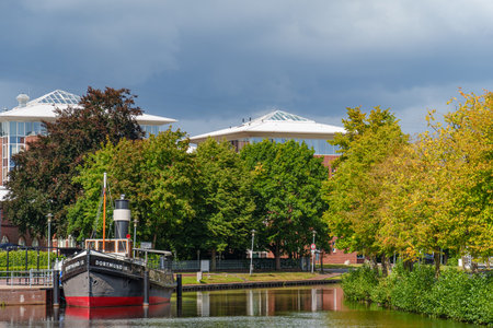 Hansestadt Stade, Germany - August 22, 2019: Old wooden sailboat and medieval houses by the canal with people around in the old town of Stade, Lower Saxony, Germany