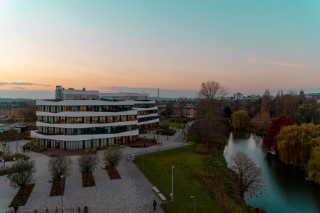 Bremen, Germany - August 5, 2019: Scenic view of the port of Bremen at sunset.