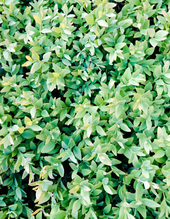 Close-up of bright green foliage boxwood Buxus sempervirens as the perfect natural backdrop. Boxwood wall in natural conditions. Natural pattern of green fence of boxwood. Lush leaves background