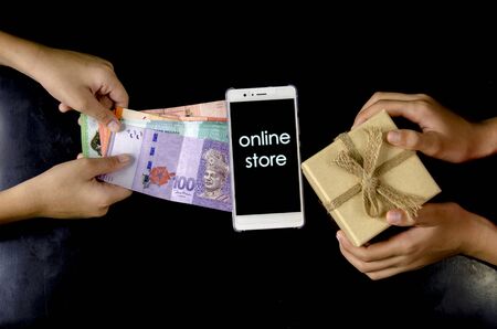 Hand holding money with smart phone written online store and other hand receiving package