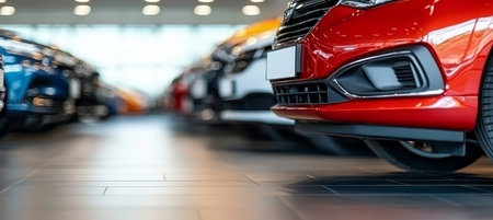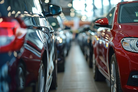 row of cars in a row in a car dealership, shallow depth of field