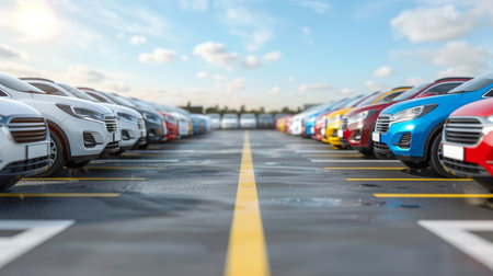 Automotive Industry, Cars Dealership Parking Lot. Rows of Brand New Vehicles Awaiting New Owners, on the epoxy floor in new car service. . Generative Ai