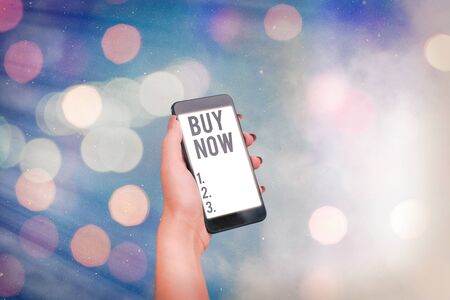 Word writing text Buy Now. Business photo showcasing asking someone to purchase your product Provide good Discount