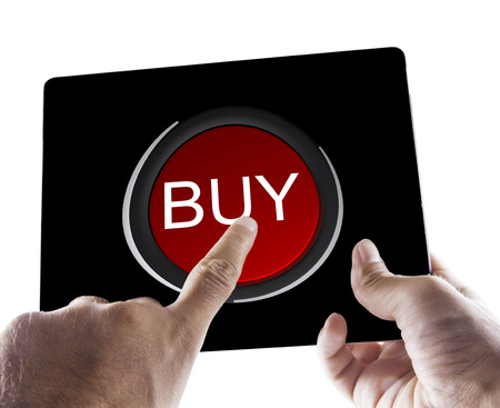 Internet shopping Female fingers clicking on BUY button on the screen of tablet PC reflection of male sales representative is visible in the screen