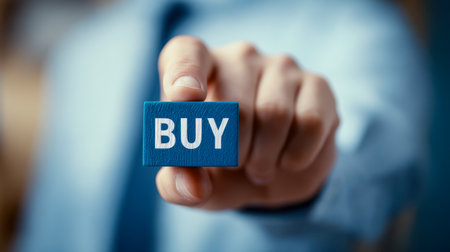 A professional in formal attire presenting a vibrant blue cube marked with “buy,†symbolizing strategic investment choices and the key role of decisive financial and mark
