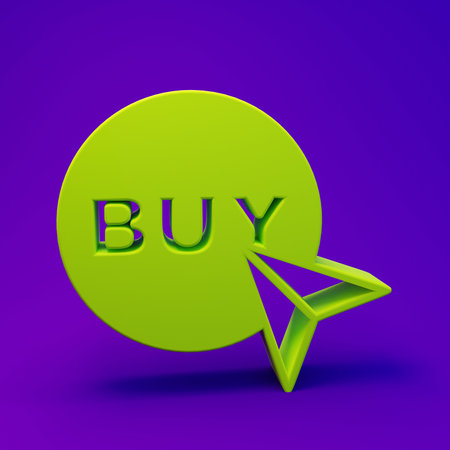 Green Buy button icon isolated on purple-blue background. Minimalism concept. 3D render illustration.