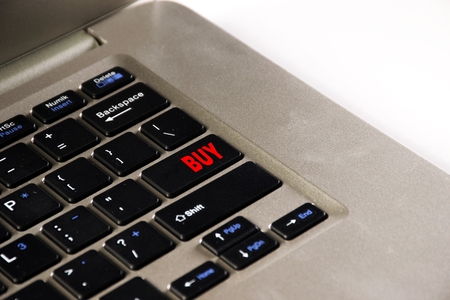 Buy now text on the illuminated buttons of the keyboard by night. Internet shopping concept.