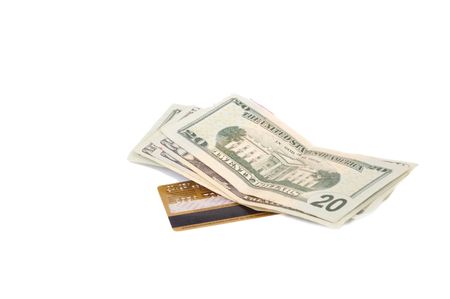 Selective focus of hand with cash and credit card payment exchanging credit card and money.