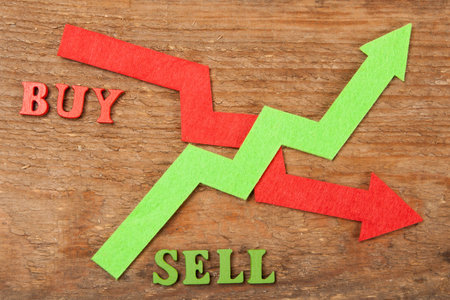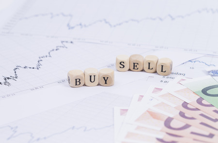 Buy and sell on stacked wooden cubes on the table. Business and finance concept