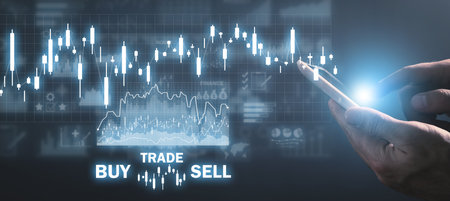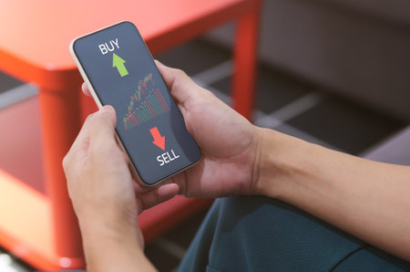 Hand of trader holding smartphone looking at Stock exchange trading data information displayed with buy and sell symbol. Investor and trader concept.