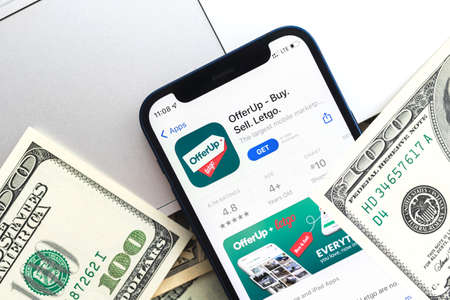Poltava, Ukraine - April 28, 2022: OfferUp shopping app on mobile phone screen. Business background with laptop and money