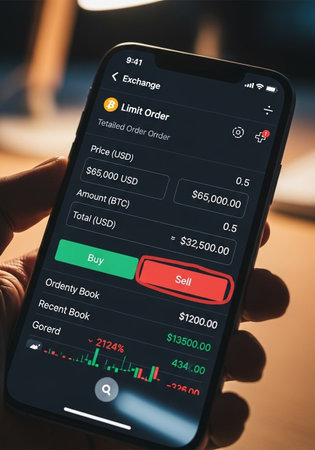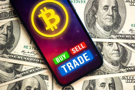 Bitcoin trading concept. Mobile phone application for cryptocurrency. Buy and sell new virtual money. Money dollars background, financial investment