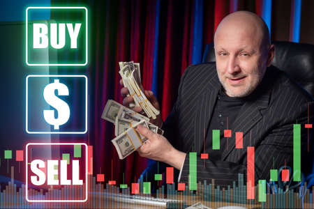Man with lots of money is smiling. Bundles with dollars in hands of a businessman. Concept - businessmen income increased. Person is engaged in trading operations. Broker on currency market. Graph