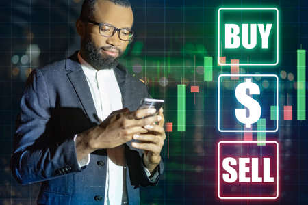 Man is engaged in investments. Concept -stock market speculation. Man trades currency through a telephone. Buttons with the inscription buy and sell. Guy exchanges currency online. Mobile bank