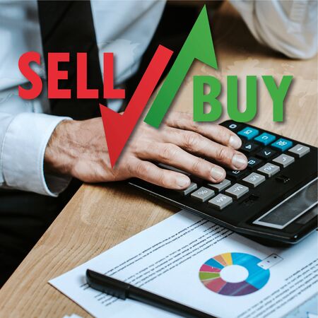 cropped view of trader using calculator near sell and buy letters