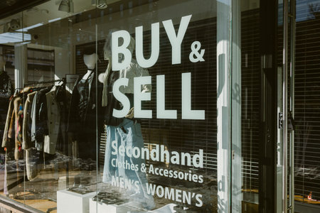 A shop on an urban street displays a big sign for buying and selling secondhand clothes and accessories.