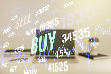 Multi exposure of abstract financial graph on laptop background, financial and trading concept